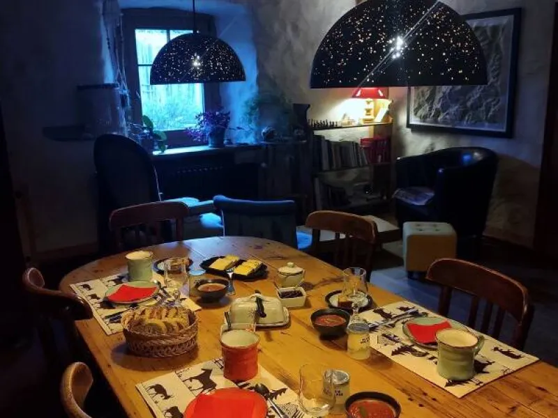 Le salon est aussi bien l'endroit où nous prenons petits déjeuner et repas, confectionnés maison, uniquement de produits frais et locaux (nous privilégions les circuits courts), mais il est aussi l'espace lecture avec ces nombreuses BD !