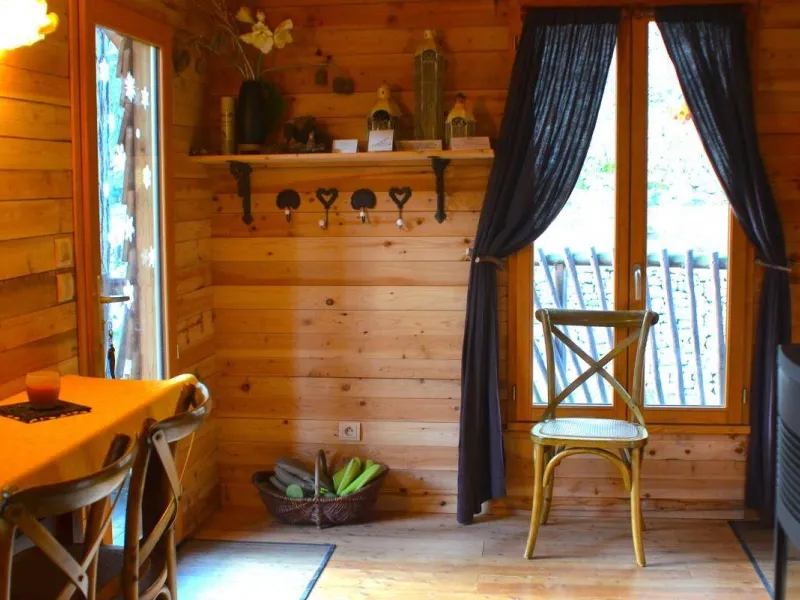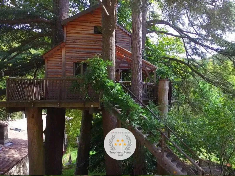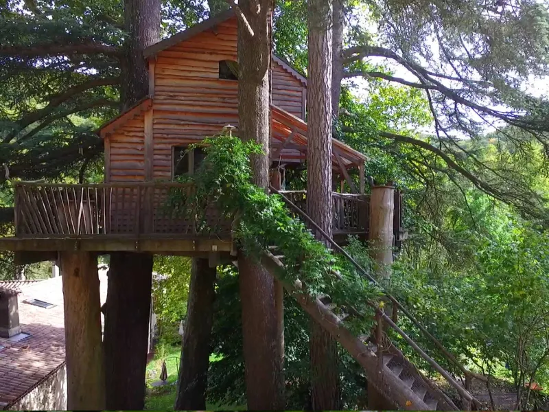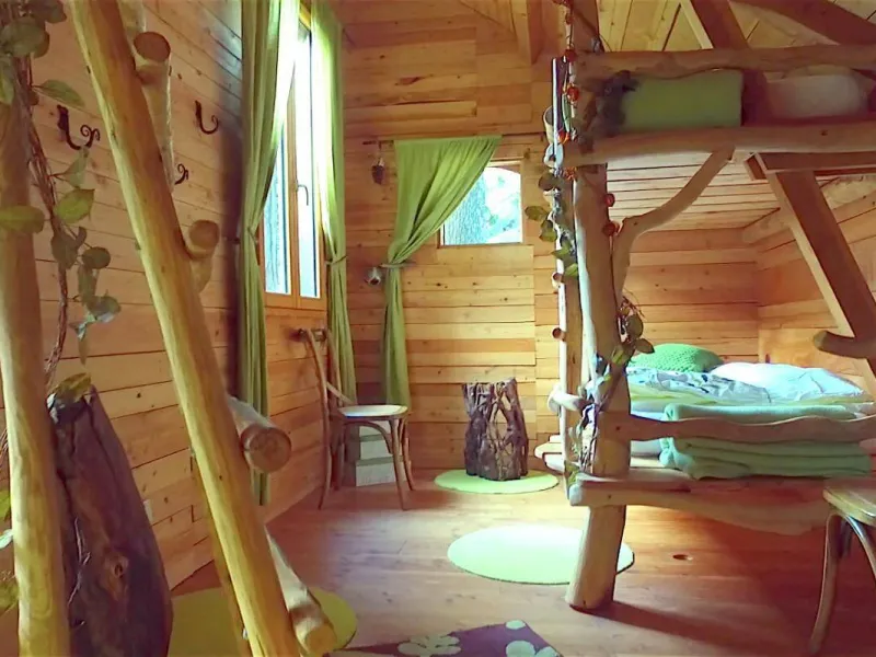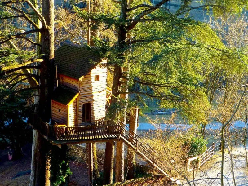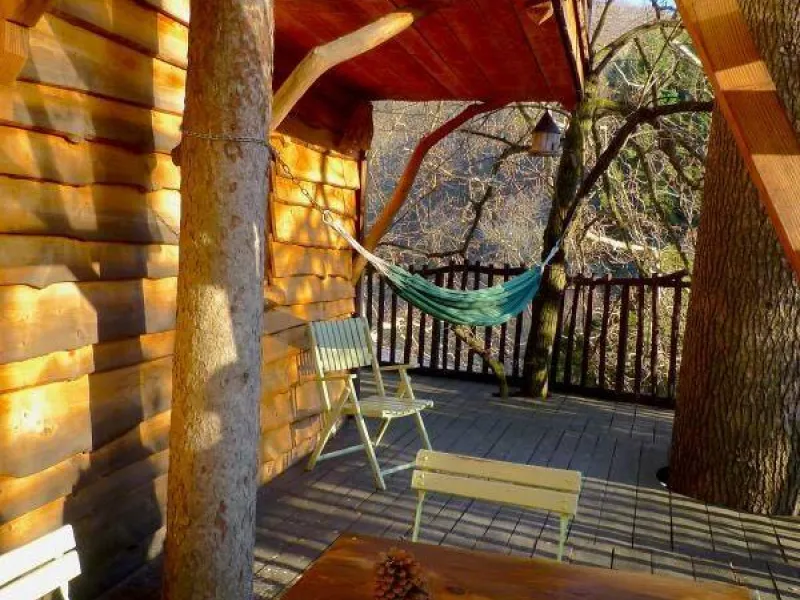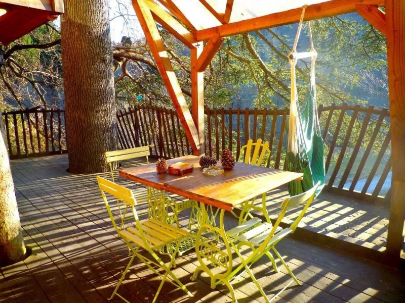 D'accès facile permettant l'accueil du plus grand nombre, vous serez charmé par ce lieu spacieux, confortable et lumineux. La cabane est aménagée sur deux étage: au rez de chaussée se trouvent la cuisine, le coin repas et les toilettes sèches. Au premier étage, tapis et coussins sont disposés devant une grande baie vitrée qui permet d’observer la nature en toute tranquillité. Le couchage est composé de deux lits simples superposés et un lit double en mezzanine. Une salle de bains dédiée aux hôtes de la cabane est accessible dans la bâtiment principal à deux pas de là. Une grande terrasse entoure la cabane. Une table et des chaises y sont disposés afin de pouvoir profiter de manger à l’extérieur pendant les beaux jours. Des hamacs sont également suspendus sur la plateforme pour procurer une détente totale au son de la nature environnante. En amoureux ou en famille, tout est fait pour vous faire rêver dans une ambiance qui incite à la détente dans un cadre 100% nature. Vous pourrez profiter des plaisirs qu'offrent chaque saisons, lové dans un hamac ou dans le coin coussins cosy donnant sur la baie vitrée. Vous serez réveillé par le clapotis de la rivière, du vent dans les feuillages et par le chant des oiseaux qui pépient dans les feuillages. Le matin, le petit déjeuner (bio) vous sera apporté à la cabane. De même si vous réservez les repas du soir, vous goûterez les bons petits plats préparés avec soin à base de produits bio et locaux. De par sa situation au milieu de Parc Naturel des Monts d’Ardèche, vous pourrez partir à la découverte des la nature qui entoure le cabane sans avoir besoin de prendre la voiture. La rivière qui jouxte la propriété est également source de joie et d’émerveillement pour le petits comme pour les grands.Localisation