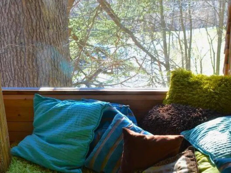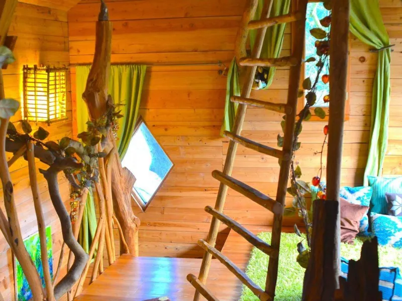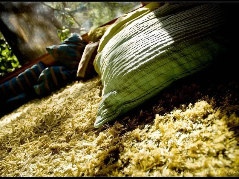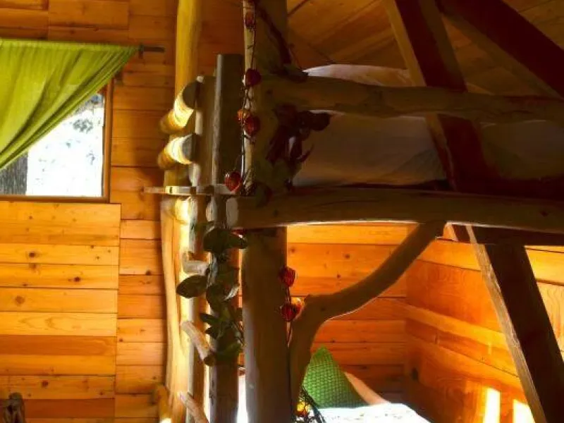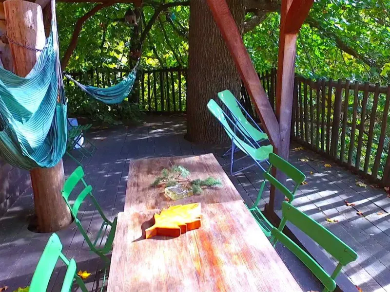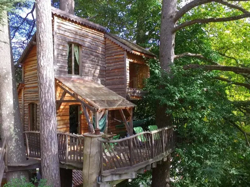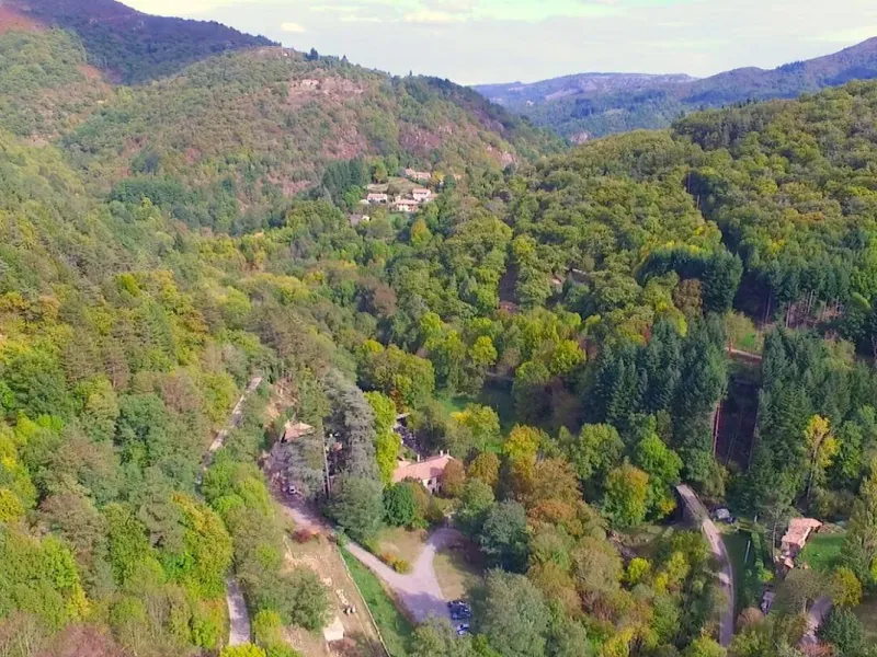 D'accès facile permettant l'accueil du plus grand nombre, vous serez charmé par ce lieu spacieux, confortable et lumineux. La cabane est aménagée sur deux étage: au rez de chaussée se trouvent la cuisine, le coin repas et les toilettes sèches. Au premier étage, tapis et coussins sont disposés devant une grande baie vitrée qui permet d’observer la nature en toute tranquillité. Le couchage est composé de deux lits simples superposés et un lit double en mezzanine. Une salle de bains dédiée aux hôtes de la cabane est accessible dans la bâtiment principal à deux pas de là. Une grande terrasse entoure la cabane. Une table et des chaises y sont disposés afin de pouvoir profiter de manger à l’extérieur pendant les beaux jours. Des hamacs sont également suspendus sur la plateforme pour procurer une détente totale au son de la nature environnante. En amoureux ou en famille, tout est fait pour vous faire rêver dans une ambiance qui incite à la détente dans un cadre 100% nature. Vous pourrez profiter des plaisirs qu'offrent chaque saisons, lové dans un hamac ou dans le coin coussins cosy donnant sur la baie vitrée. Vous serez réveillé par le clapotis de la rivière, du vent dans les feuillages et par le chant des oiseaux qui pépient dans les feuillages. Le matin, le petit déjeuner (bio) vous sera apporté à la cabane. De même si vous réservez les repas du soir, vous goûterez les bons petits plats préparés avec soin à base de produits bio et locaux. De par sa situation au milieu de Parc Naturel des Monts d’Ardèche, vous pourrez partir à la découverte des la nature qui entoure le cabane sans avoir besoin de prendre la voiture. La rivière qui jouxte la propriété est également source de joie et d’émerveillement pour le petits comme pour les grands.Localisation