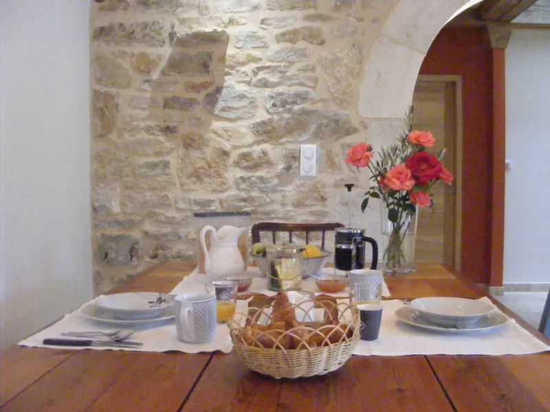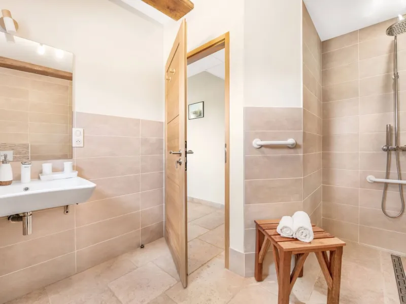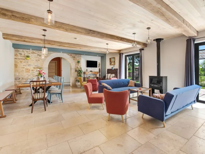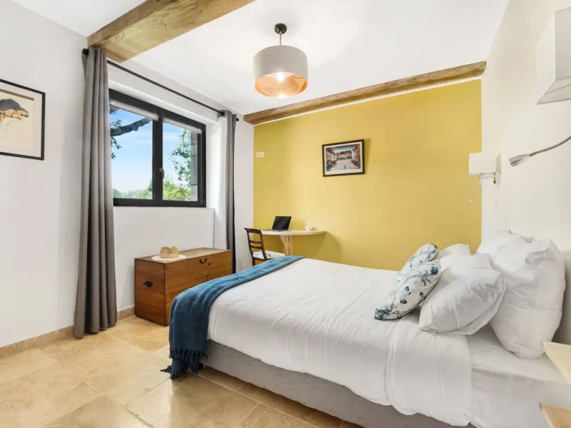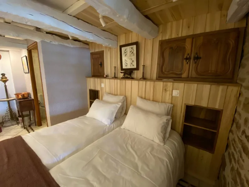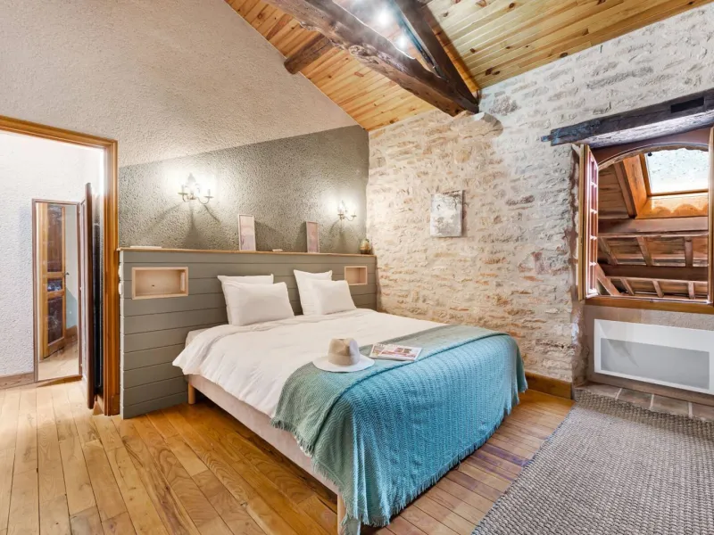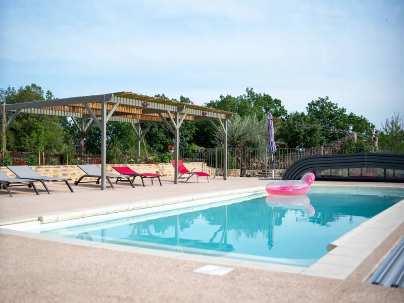 Beautiful, fully renovated stone house with, on the ground floor, an entrance hall giving access to a living room with sitting area (2 3-seater sofas on either side of a wood-burning stove, 4 armchairs, coffee table, TV, DVD player, Satellite TV), kitchen area (fitted units LV, MO, fridge, 1 additional fridge, 1 freezer), dining area. 1 ground-floor toilet with hand-washer and heated towel rail. 2 bedrooms accessible to people with reduced mobility (1 double bed each with en-suite shower room and toilet). Storage space under the stairs. Large terrace in front of the property with shade arbour. Enclosed swimming pool (secure gate) 10 x 4 with steps and paddling pool area. Pretty lawned grounds surrounding the gîte. Parking spaces in front of the building and electric charging point.Wifi in bedrooms and USB and RJ45 sockets in all rooms (ideal for teleworking).