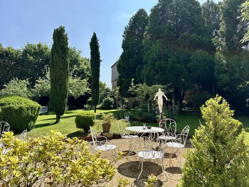 Lovely, well-treed garden with a small fountain, several sets of garden furniture and sun loungers.