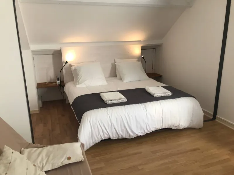 The 25 m² "Bourgueil" room, located on the first floor, offers a view of the magnificent Tour de Trèves. It has a king-size bed and a sofa bed. Extra bed for 1 person available on request. Italian-style shower. Sleeps 2 to 4.
