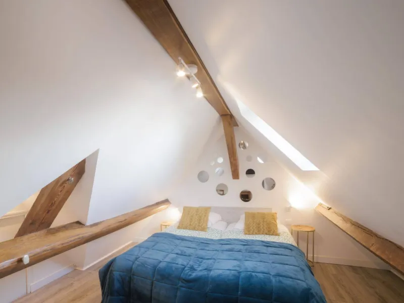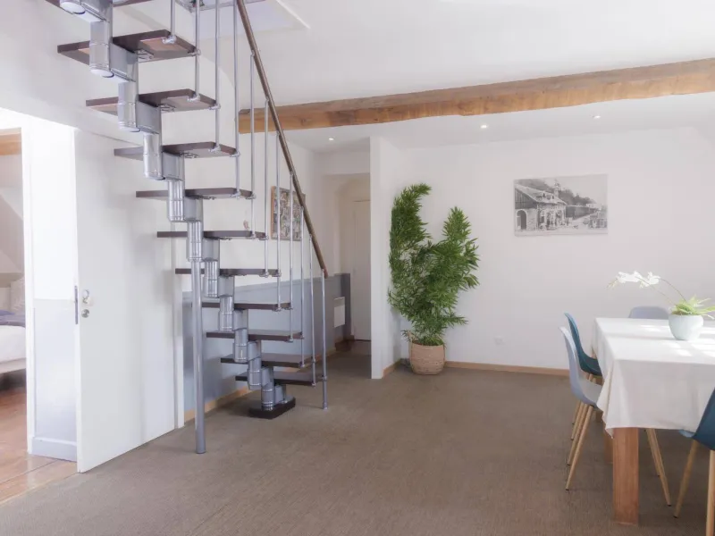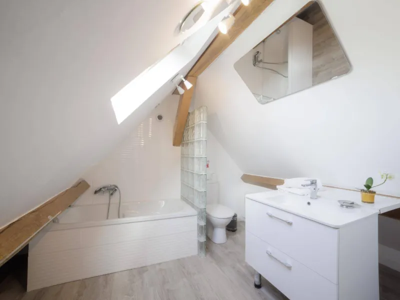 Upstairs is the Passion Fruit bedroom with 2 single beds (80 cm), which can be pushed together, the individual bathroom (bathtub), WC and television.