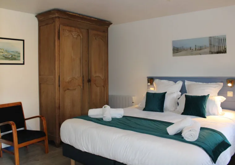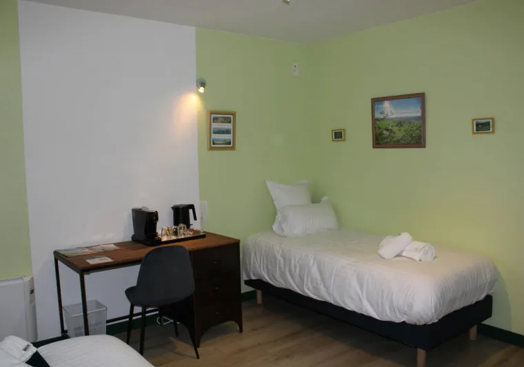 These 4 guest rooms can accommodate up to 14 people, 2 rooms on the ground floor for 3 people each (1 bed 140 and 1 bed 90) and 2 family rooms, upstairs for 4 people each (1 bed 160 and 32 beds 90). One of them is approved by Tourism Handicap.