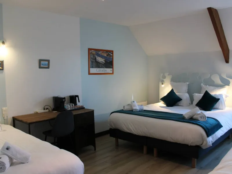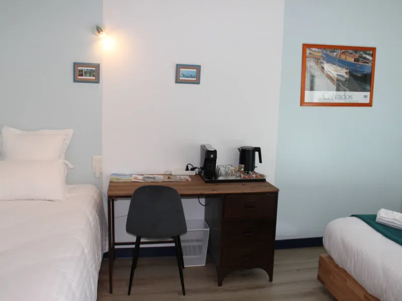 The guest room "La Mer" is located on the first floor. It is suitable for 4 people maximum (1 bed 140 and 2 beds 90). A shower room with WC is adjacent. There is no TV. Pets are not accepted.