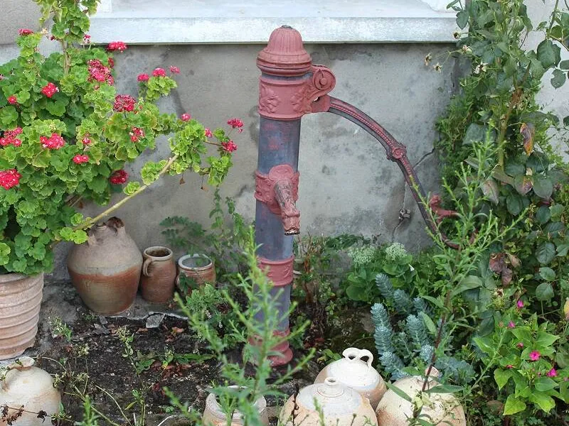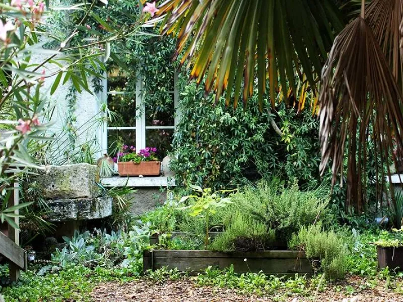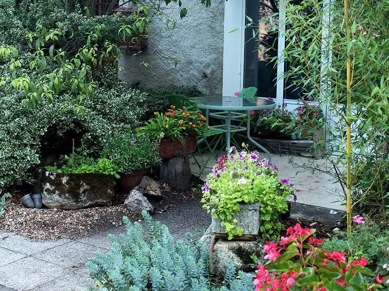 Garden chairs invite you to rest in the wooded area behind the house where there is also a swing and a slide.