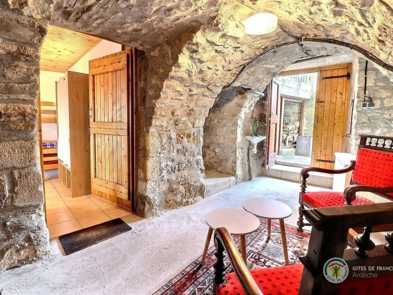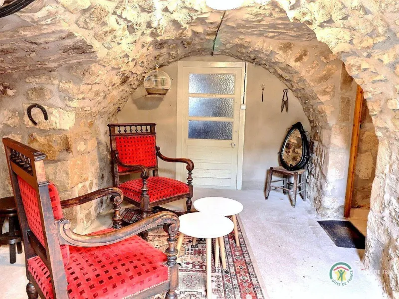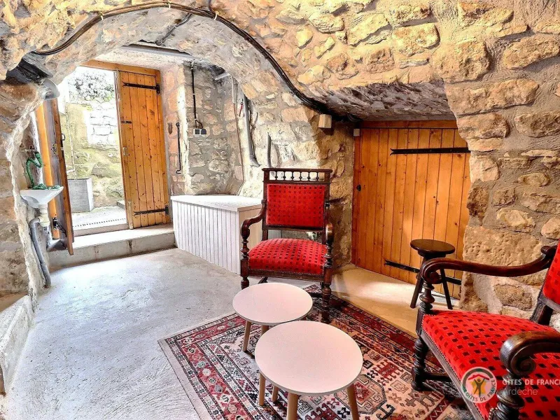 L'accès à la chambre se fait par quelques marches. Vous descendrez dans une pièce voûtée, tout en pierres apparentes, qui sert de petit salon puis accéderez à la chambre.