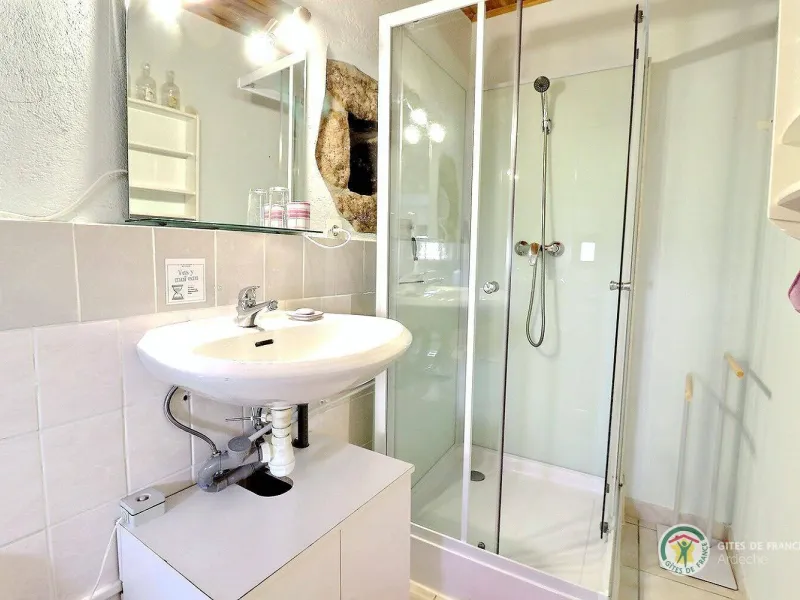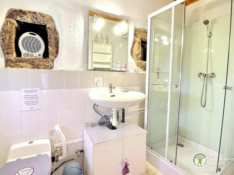 Celle-ci comprend 2 lits (1 en 140 et un en 90), un petit bureau avec plateau de courtoisie (thé, café), une table avec chaises, une salle d'eau avec cabine de douche, wc.