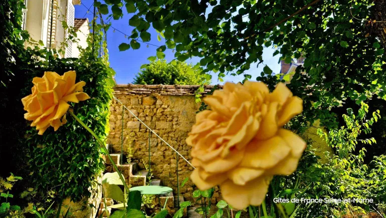 Mitoyenne à la maison de Jeanne et Sergio, vos hôtes, elle se situe à l'étage et donne sur le joli jardin fleuri et arboré. Son accès privatif par un escalier extérieur en pierre, vous garantit autonomie et tranquillité.