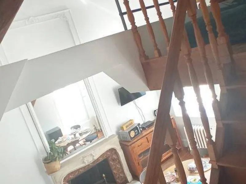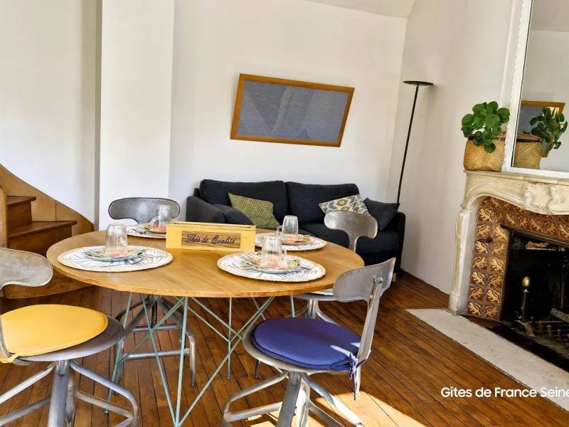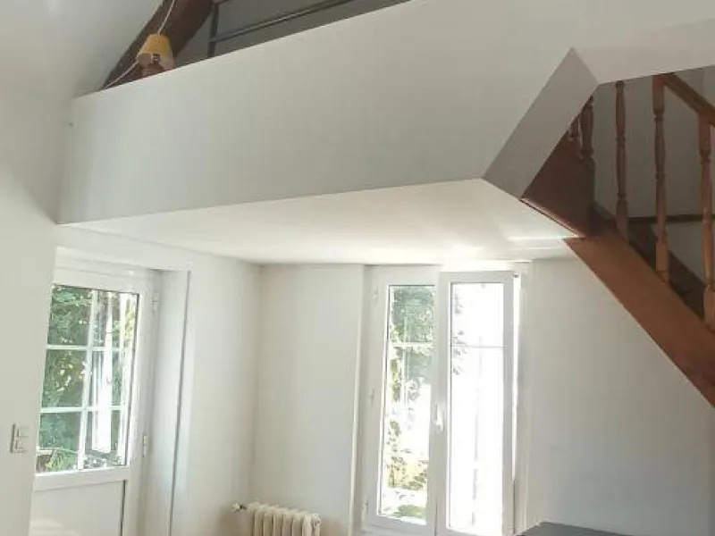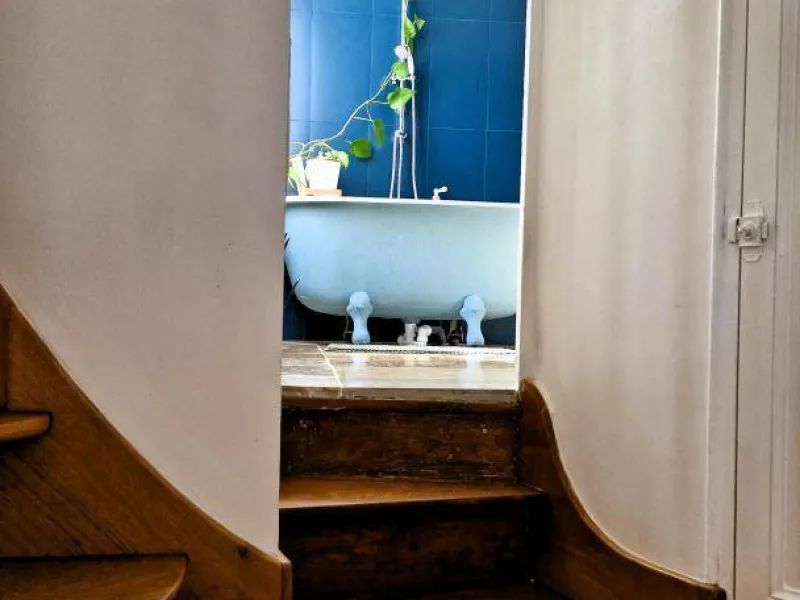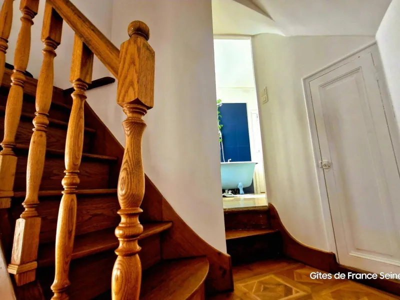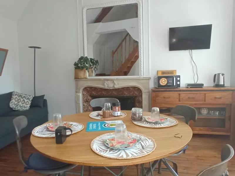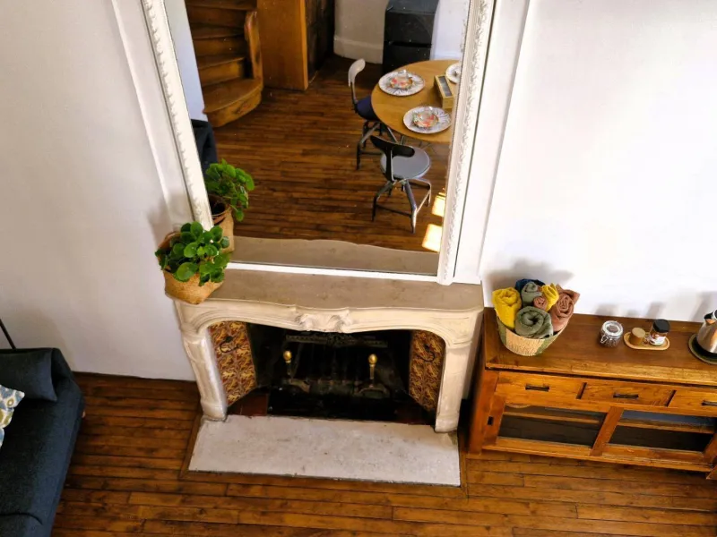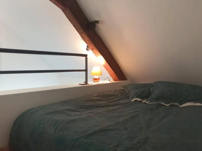 The layout is rather unique: you have a bright, double-height living room with a table, TV, a sofa bed offering comfortable sleeping for two (140x200 cm), and some basic kitchen equipment if you prefer to prepare your meals (small refrigerator, microwave, kettle, and dishes). A beautiful wooden staircase leads to the bathroom with a heated towel rail, bidet, and toilet, as well as the mezzanine under the eaves (note the low ceiling) which accommodates a double bed (140x190 cm mattress).