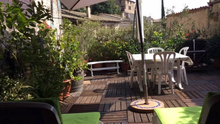 Large terrace with patio furniture and reading nook.