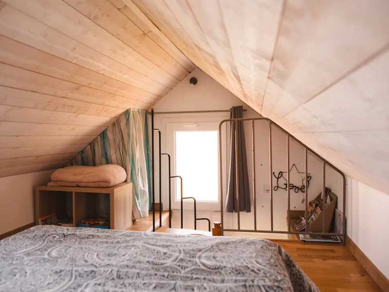 Upstairs (steep staircase - see photo) is the sleeping area (double bed).