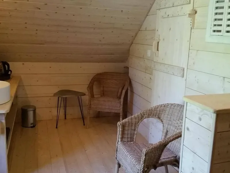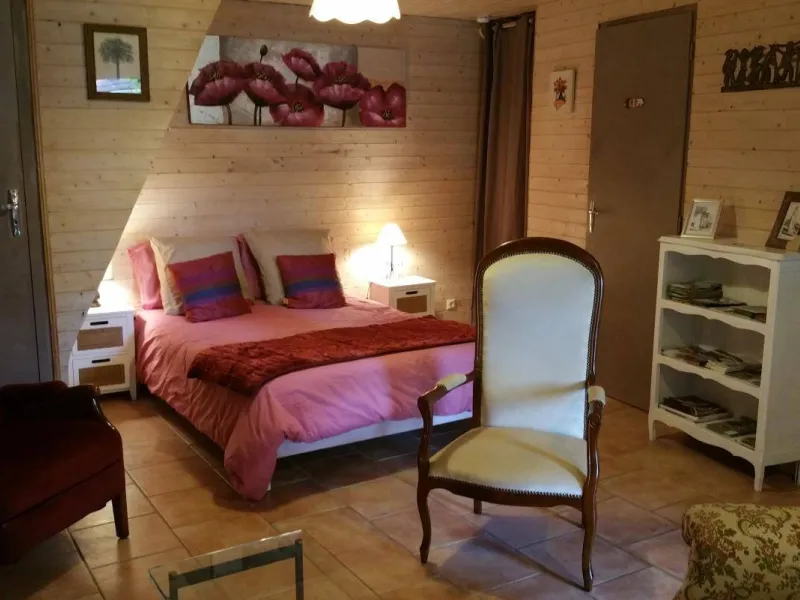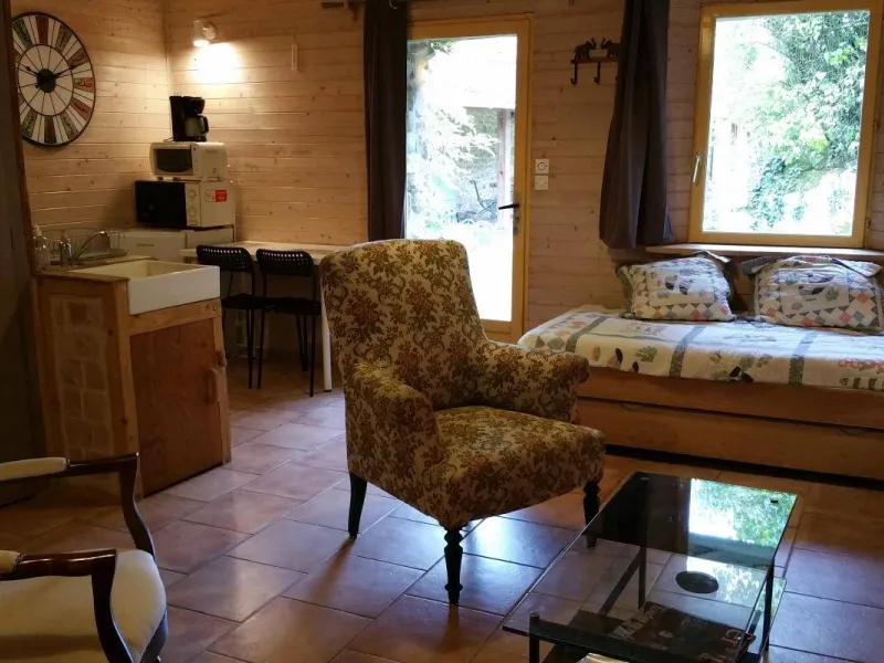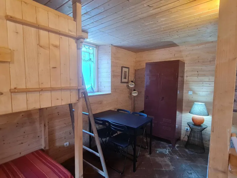 Discover the 'Nature' room, a charming 16 m² duplex with a wooden chalet feel. A little cocoon of serenity opening directly onto our peaceful garden to the west of the property. Nestled back, this single-storey room offers absolute peace and quiet, ideal for a relaxing getaway with a view of the mountains and donkeys.
