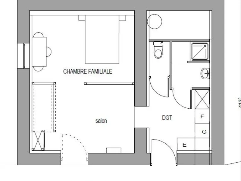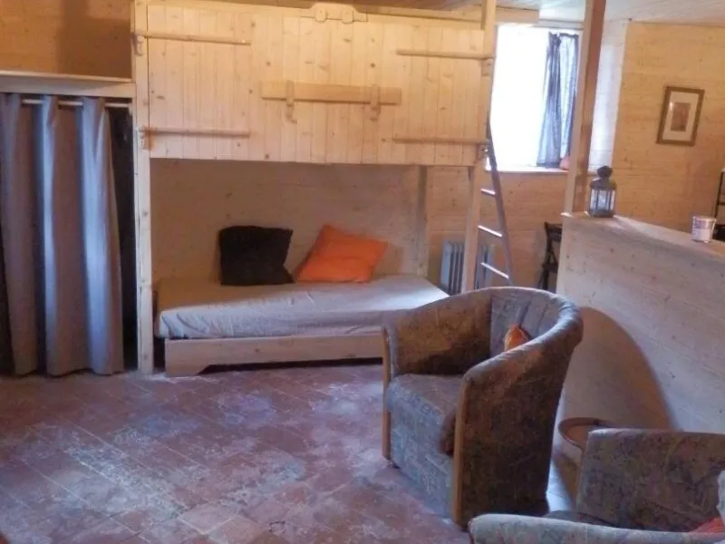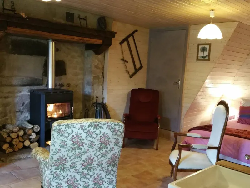 This spacious room (35 m² + 20 m² with duplex) is ideal for couples, families or groups, with its south-facing terrace and peaceful setting. Cosy sitting area around the wood-burning stove.