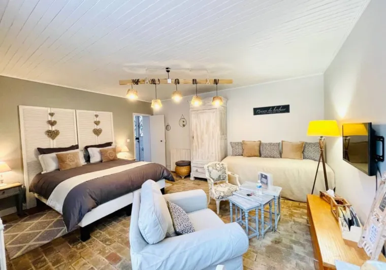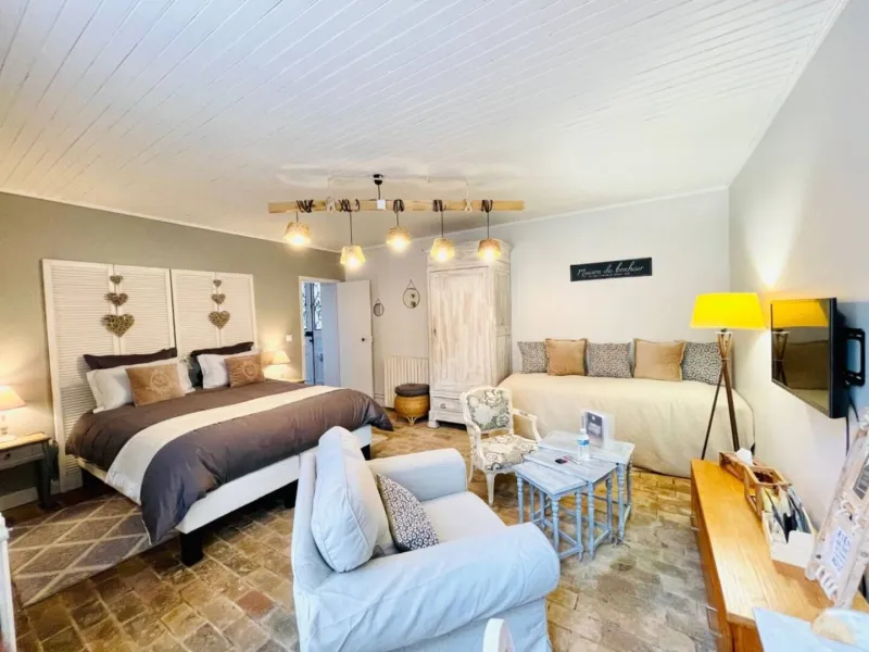 Plongé dans la douce ambiance des maisons de famille, cet espace de vie cocooning propose un parfait équilibre entre charme et fonctionnalité. Il est situé au rez-de-chaussée avec et accueille jusqu'à 3 hôtes.La Marquise Barbot