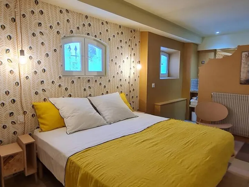 Chambre Safran, double room, king-size bed or two 90cm beds, street view and private toilet outside the room.