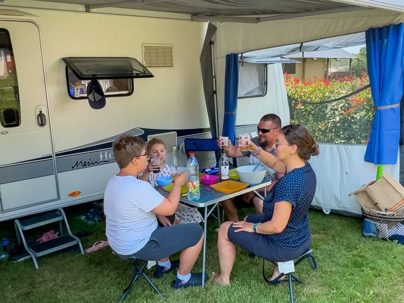 Snack at the campsite, restaurant in the village, 5 min walk.