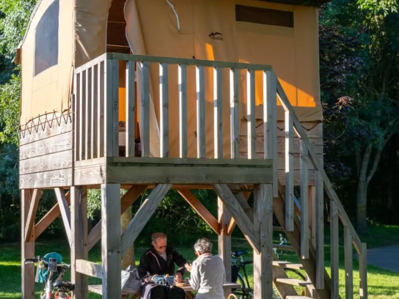 and 2 new products for 2025: the cabanétape for a night in an all-wood cabin and the Maasaï tent set up on stilts 2 metres high with a view of the forest or the Loire!