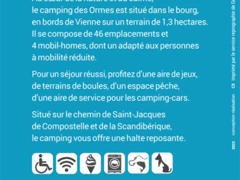 In the heart of nature and in a peaceful setting, Camping des Ormes is located in the village, on the banks of the Vienne river, on a 1.3-hectare site.It comprises 46 pitches and 4 mobile homes, including one adapted for people with reduced mobility.