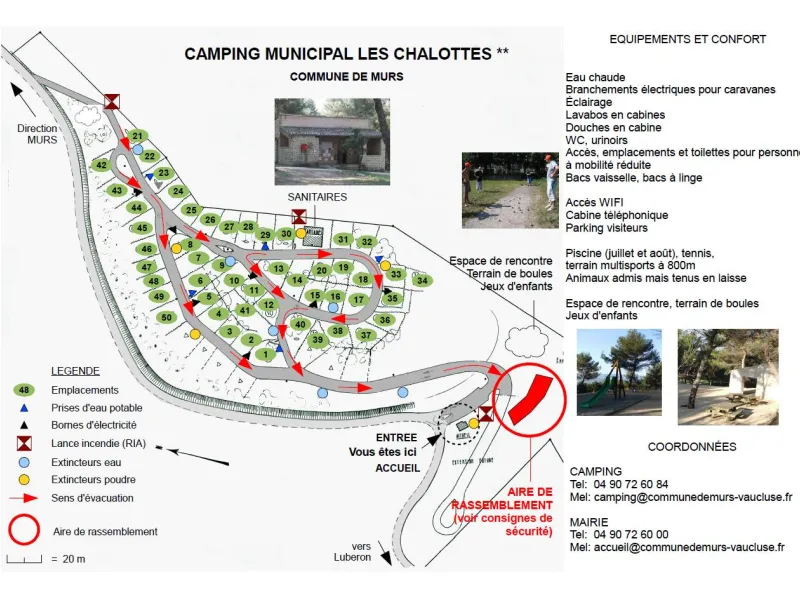 Vous disposez de tous les équipements souhaités : 50 emplacements avec 36 branchements électriques pour caravanes , camping-car et le confort dans les sanitaires ( eau chaude, lavabos et douche ).