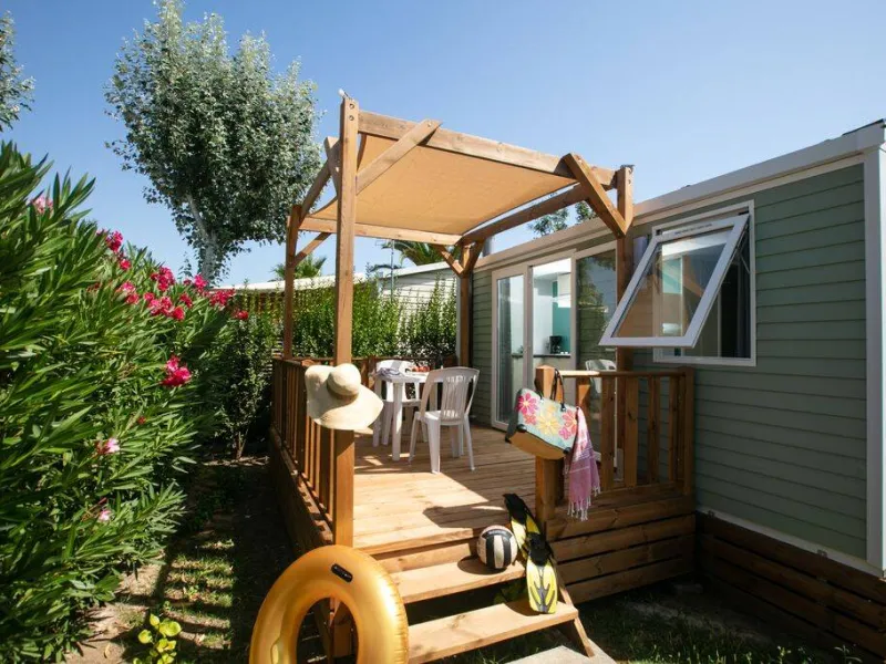 Camping situé au bord du fleuve Hérault (appontement gratuit), dans un environnement calme. Piscine et Aquapark chauffés au printemps et à l’automne, pataugeoire, jacuzzi, 2 aires de jeux, tennis de table, terrain multisports, salle de sport. Animations 2 fois par semaine en haute saison. Plage et port de pêche à 2 km. Alimentation, bar. Lavabos en cabine avec eau chaude, machines à laver, eau chaude pour vaisselle, aire de vidange camping car réservée à notre clientèle165 emplacements électrifiés et délimités par des haies, dont 50 “Grand Confort”. Internet WiFi payant sur tous les emplacements et dans tous les mobil-homes.