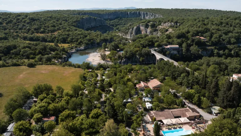 Ideally located between Ruoms and Vallon-Pont-d’Arc, Camping du Pont welcomes you to the peaceful atmosphere of Pradons, in the heart of an exceptional natural landscape. Nestled along the banks of the Ardèche River, with its sandy shores and preserved surroundings, our campsite offers an authentic setting where serenity and the art of living come together.