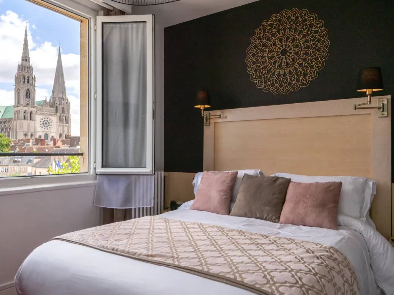 Just a few steps from Notre Dame Cathedral, Le Boeuf Couronné has been run by the same family for nearly a century. It has established itself as one of the unmissable addresses in Chartres. Marie-Christine Vinsot, granddaughter of the founder, Gaston Peillon, will be happy to welcome you in her hotel of 17 rooms, all with a personalized decoration in a contemporary style and a warm atmosphere. Le Bœuf Couronné also makes you rediscover a traditional cuisine revisited throughout the seasons in its restaurant "L'Amphitryon", by its young chef Michele Celozzi. You can also enjoy a glass of wine or a delicious cocktail concocted by Christophe at the bar "Le Christie's". You will have the chance to enjoy a superb view of the Cathedral.Localisation