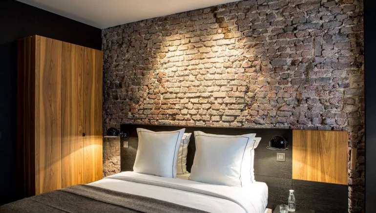 The decoration of the rooms has been carefully worked. The brick walls, preserved and restored, are a nod to the past of the place. The color black was chosen for the walls, while the lighting was particularly well thought out, to create an atmosphere conducive to the evening, after a day of sightseeing or work. The whole is in contrast with the very clear bathrooms.