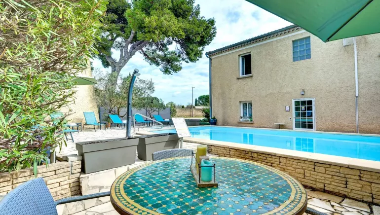 The heart of the site: its interior terrace provides calm and rest, facing the swimming pool, ideal for families, couples or simply to relax after a day's work.