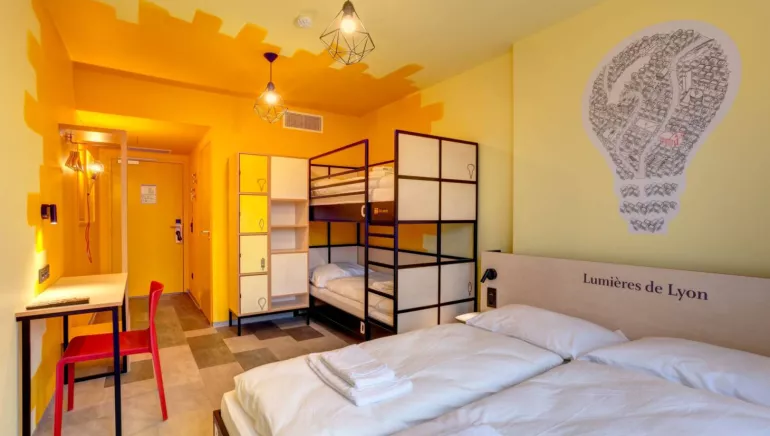 Ses 169 chambres (590 lits) sont spacieuses et lumineuses, doubles ou dortoirs de 4 à 8 lits, son bar accueille Lyonnais et visiteurs autour du snacking et planches jusqu'à 23h.
