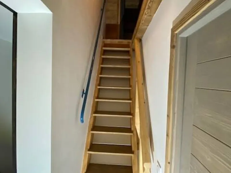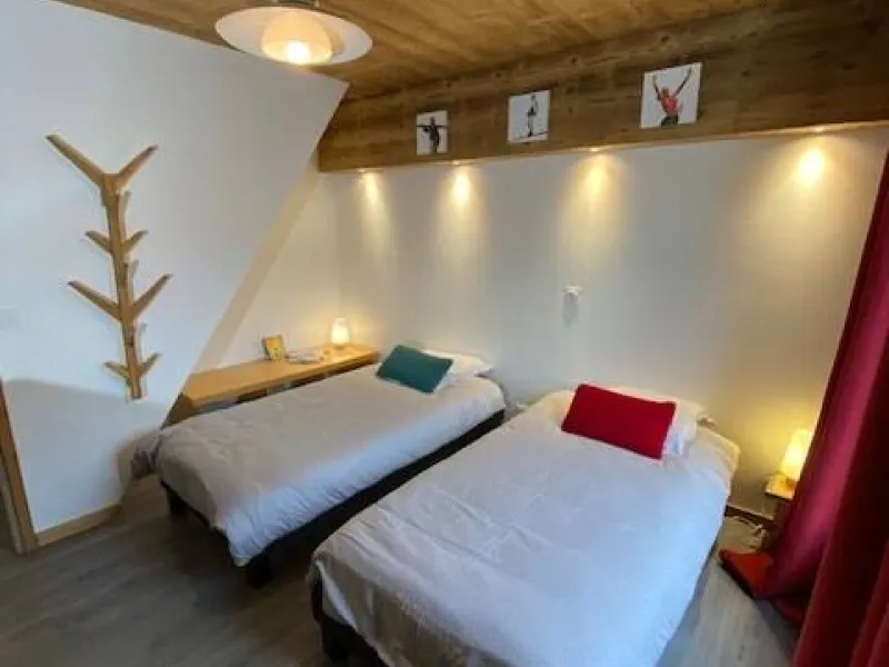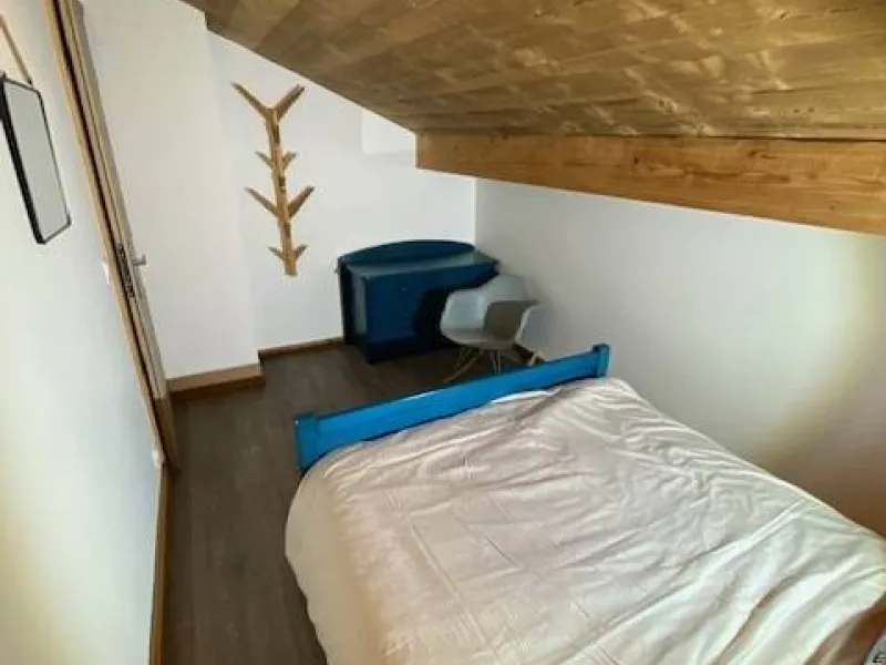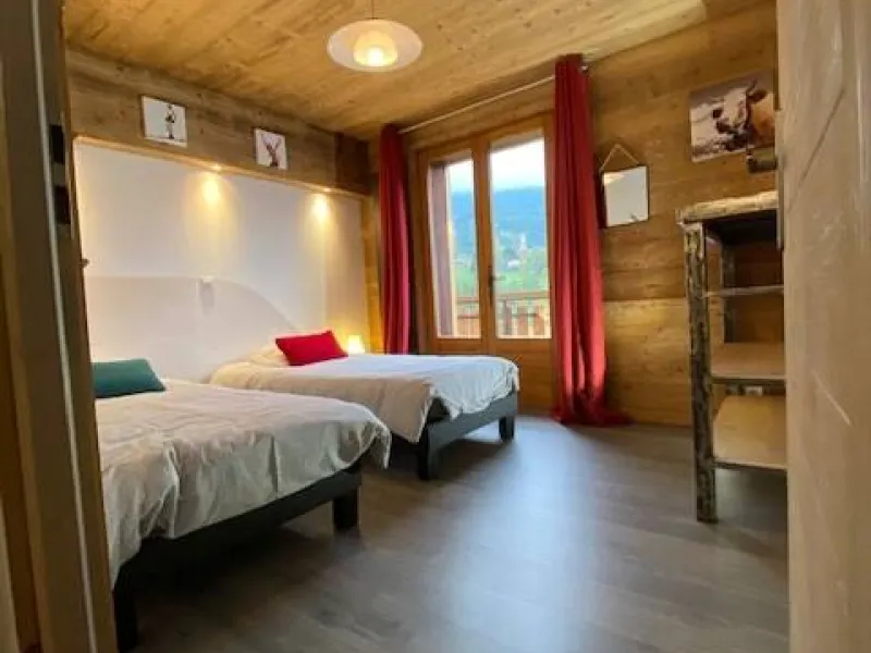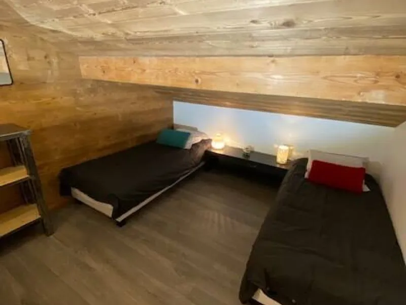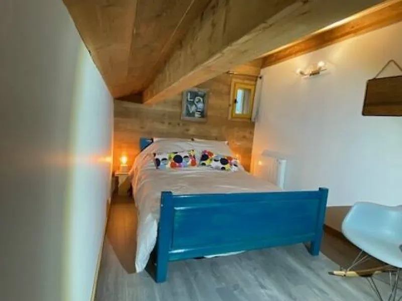 A l'étage, deux chambres sont à votre disposition, 1 avec un lit double et l'autre avec 2 lits simples. La disposition des lits simples est modulable. L'escalier est assez raide.