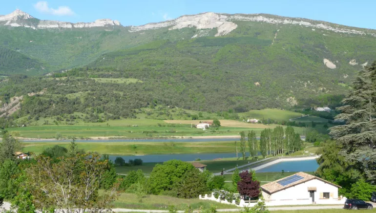 The living room (with air conditioner) has a panoramic view with a bay window and a large terrace with a view of the lake of la Germanette and le Beaumont.