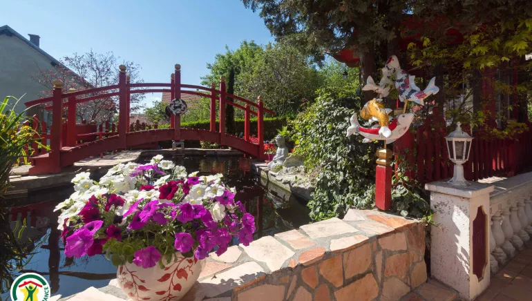 Very beautiful landscape garden flowered and with japanese touchs like a carp pond.