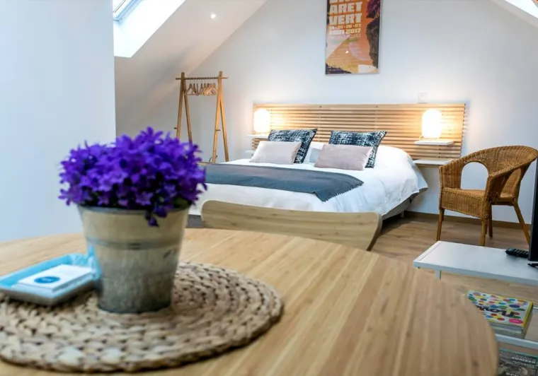 Located on the "Voie verte" cycle path in an idyllic setting with a magical view of the 4 Fils Aymon estate. Discover or rediscover your wedding night in an original room. 5 rooms: La cabane: Allard La grotte: Guichard L'échiquier: Richard La mauve: Renaud La chambre de groupes (7 personnes) - Possibility of a couple with 1 child in this room. All rooms are comfortable, with en-suite bathrooms. Wi-fi in all rooms. Television in each room. Total capacity of 15 people. Private parking. Fully equipped kitchen. Rates: from ?40 for 1 person in a group room and from ?69 for a double room (off-season). Rosalies, small electric boats, bicycles, canoes and mountain bikes also available for hire.Localisation