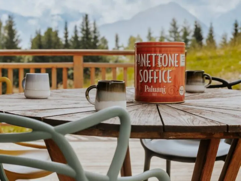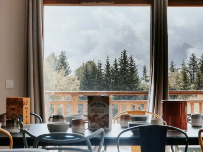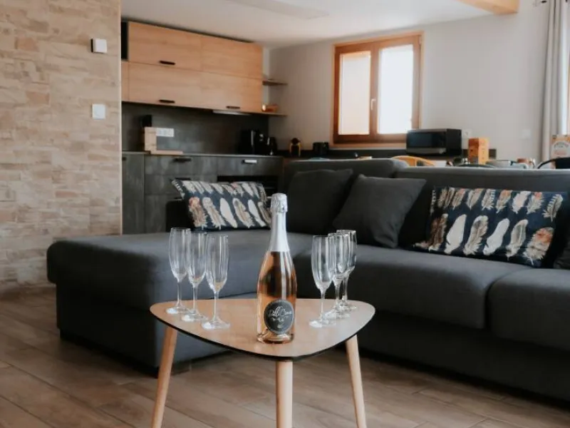 a living room with balcony composed of a lounge area with TV and sofa bed, a dining area for 14 people and an open kitchen of 10m2, fully equipped