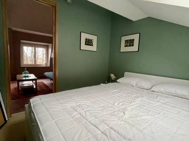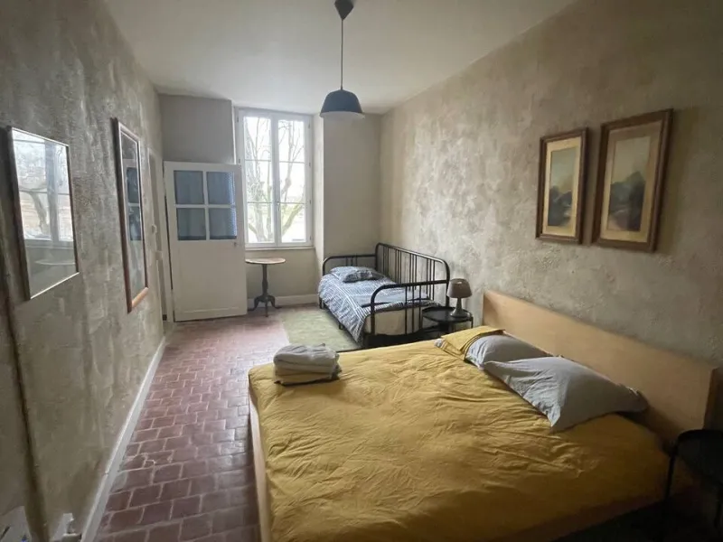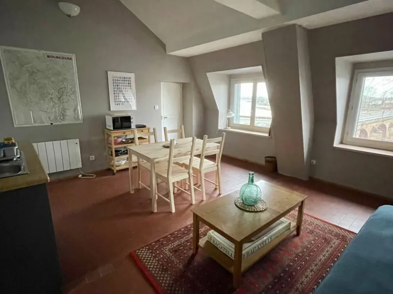 On the second floor, there is a large flat of 30 m2 with a breathtaking view of the Loire bridge and exposed beams. Small bedroom overlooking the quiet courtyard, bathroom plus separate toilet, kitchenette equipped with hob, microwave, toaster, kettle, etc. By using the sofa bed, this flat can accommodate up to 4 people.