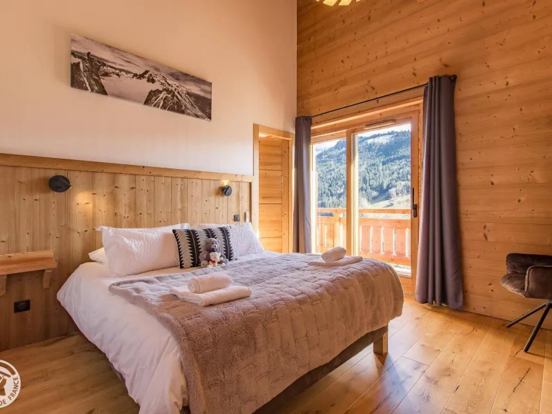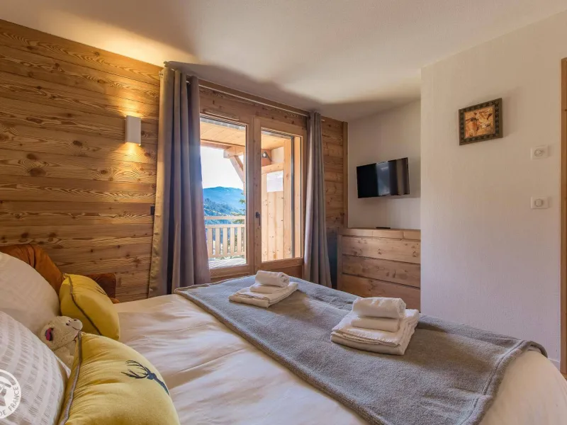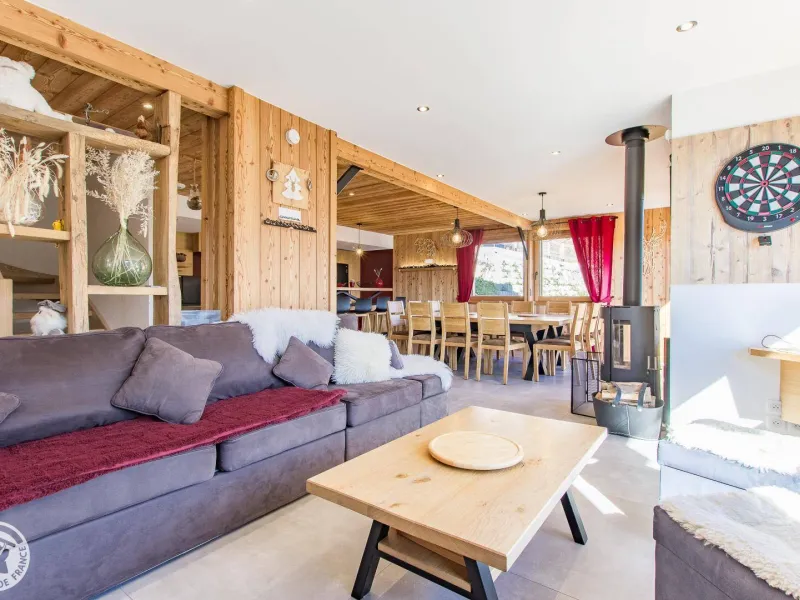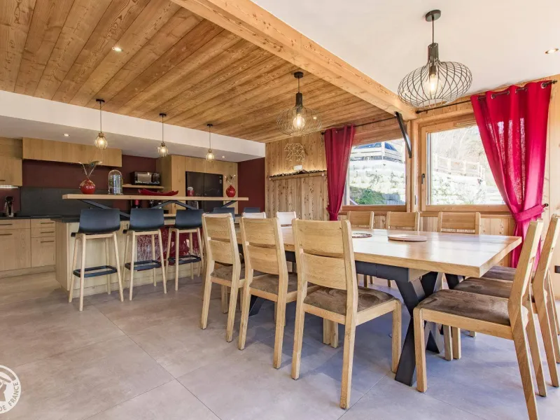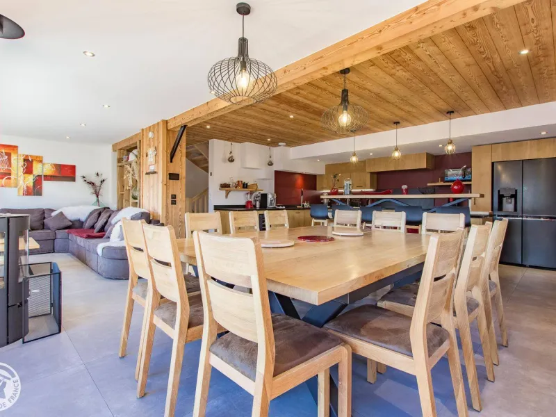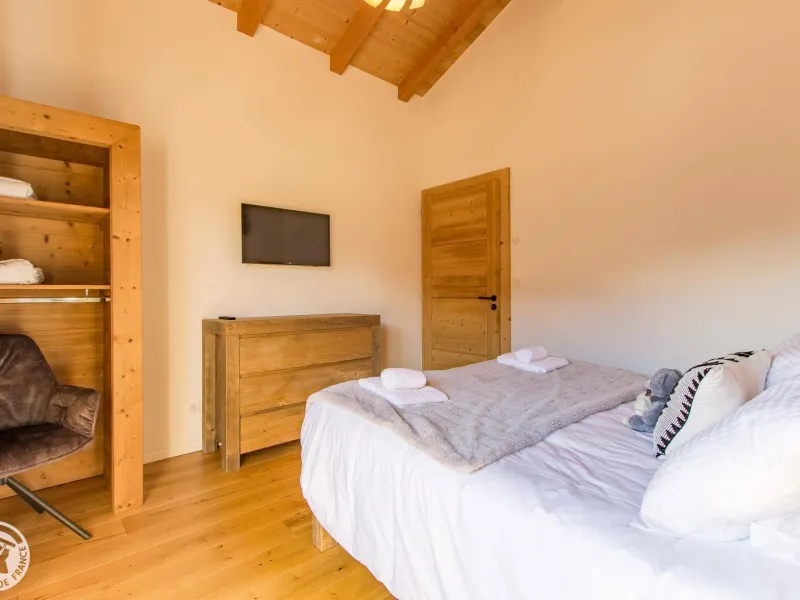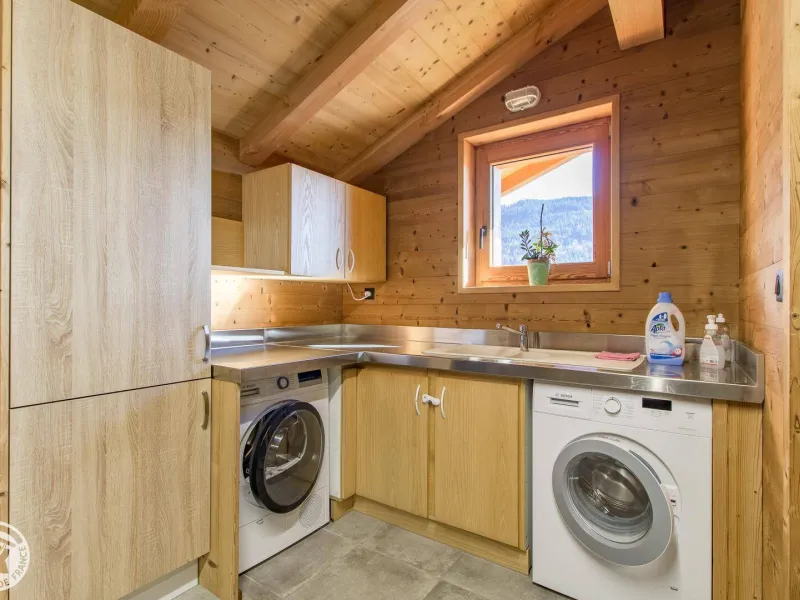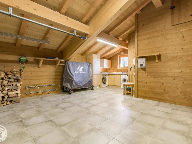 Magnificent independent chalet (190m²) arranged on 3 levels. You will be welcomed by the owner who lives in the neighboring chalet. Entrance via the top floor / ground floor (parking level): large double garage of 36m² with laundry area (washing machine and dryer), entrance hall / skiroom with shoe dryer. Bedroom 1 (1 bed 160x200cm, shower room/wc).Lower level: equipped kitchen open to the living room: large dining table, wine cellar, corner sofa, television, Bluetooth equipment, wood stove, darts board... bay window giving access to the balcony with the garden table . Bedroom 2 (1 bed 160x200cm, bathroom), separate toilet.