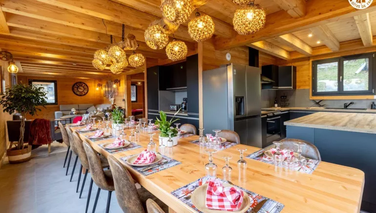 A 160m² chalet cocoon, it has 6 bedrooms (6 double beds or 12 single beds), a sauna, a garage for 2 cars, and another garage for bikes and motorcycles.
