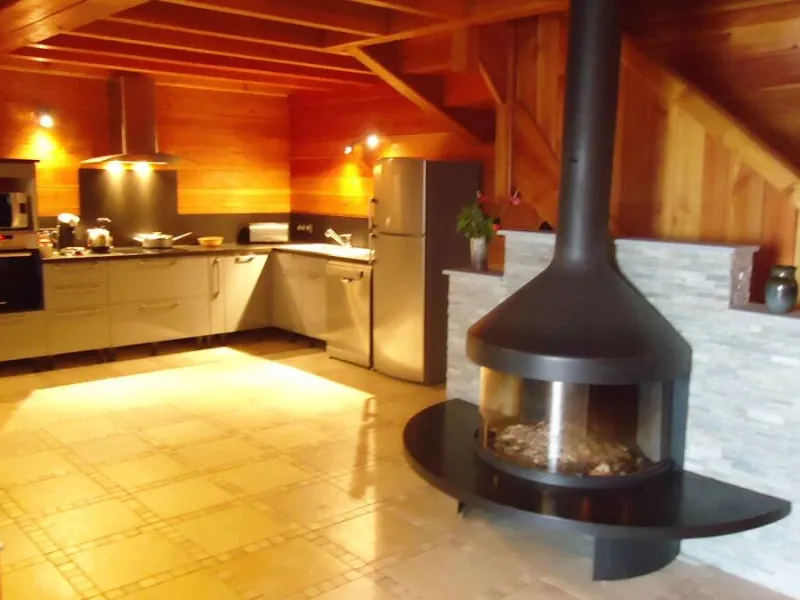 The living room is 40m² : kitchen area, a fireplace, view on the moutains.