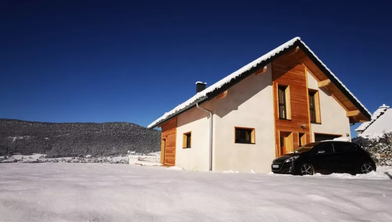 Un grand chalet neuf de charme pour 12 personnes : espace et bien-être. Harmonie intérieure chaleureuse et intime mêlant bois et murs blancs, avec charpente apparente à l'étage issue des forêts d'Autrans-Méaudre.