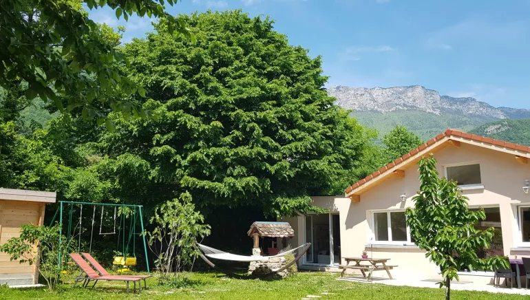 Terrain entièrement clôturé, privatif et entouré de végétation, partie terrasse et pelouse permettant aussi d'utiliser une piscine enfant fournie.