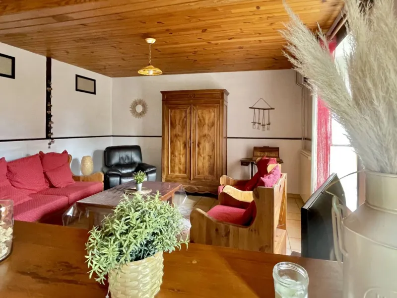 cuisine, séjour, poêle cheminée, salon en demi-niveau, 1 chambre (1 lit de 160), salle de bains (baignoire), wc indépendant.
