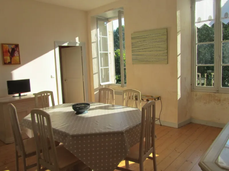 Votre appartement, simple à vivre et très bien équipé, se situe dans un ensemble de 3 locations avec jardin commun et parc s'ouvrant sur la vallée maraîchère de l'Arnoult.Location saisonnière pour 6 personnes sur le site exceptionnel de l'abbaye romane de Trizay des XIe et XIIe s. Appartement situé au 1er étage. Cuisine bien équipée avec four et micro-ondes. Séjour avec télévision. Salle d'eau avec WC séparés. 1 chambre indépendante avec 1 lit de 140 cm. 1 chambre indépendante avec un lit de 140 cm et 1 chambre indépendante avec 2 lits de 90 cm.