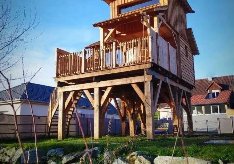 The mezzanine bedroom features a 140cm bed with bolster, pillows and comforter, ready for your arrival. A small closet and storage space for your clothes.