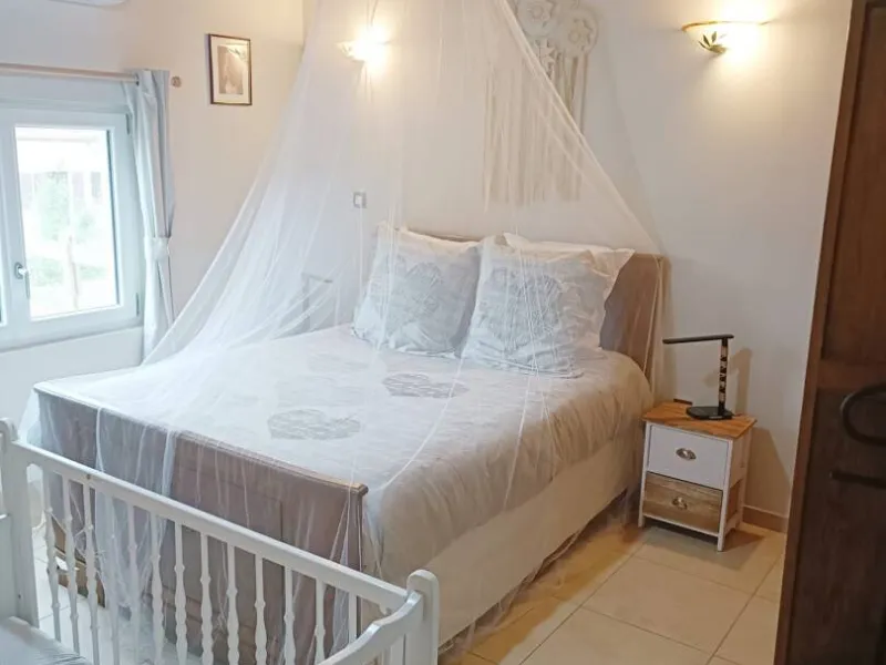 * La chambre parentale offre un couchage double (en 140) surélevé, accessible PMR et aux fauteuils roulants.