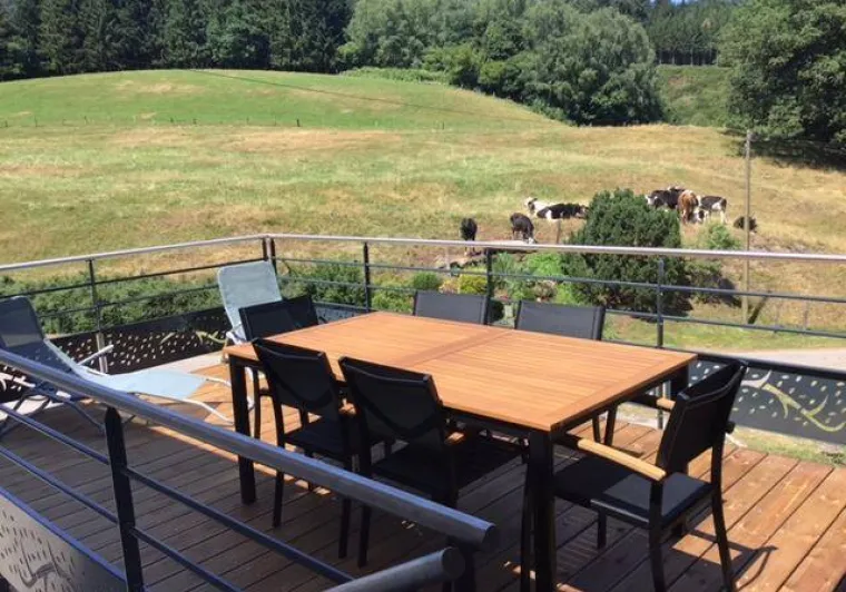 Terrace with garden furniture, hammock, barbecue, shade cloth and view of fields and stream.
