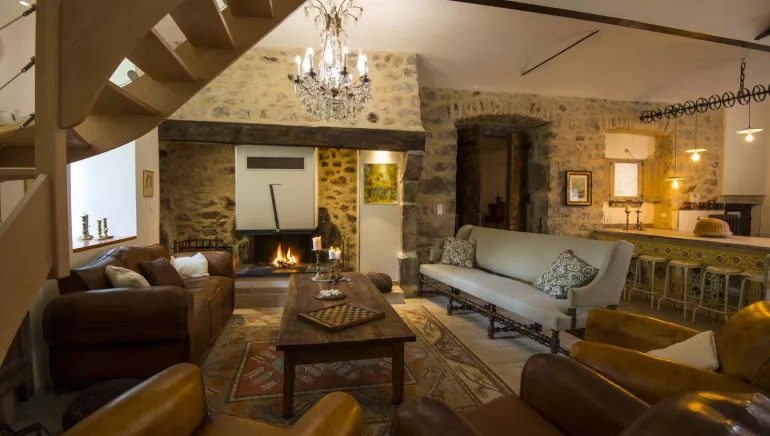 Le gite est composé d’une vaste et très belle pièce de vie intégrant l'espace repas, une cuisine intégré entièrement équipée ainsi qu'un espace salon devant une grande cheminée à bois.