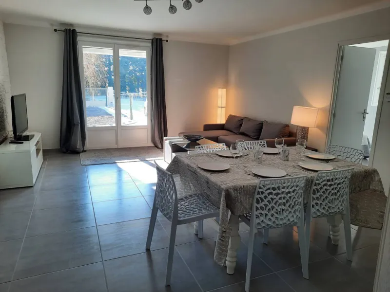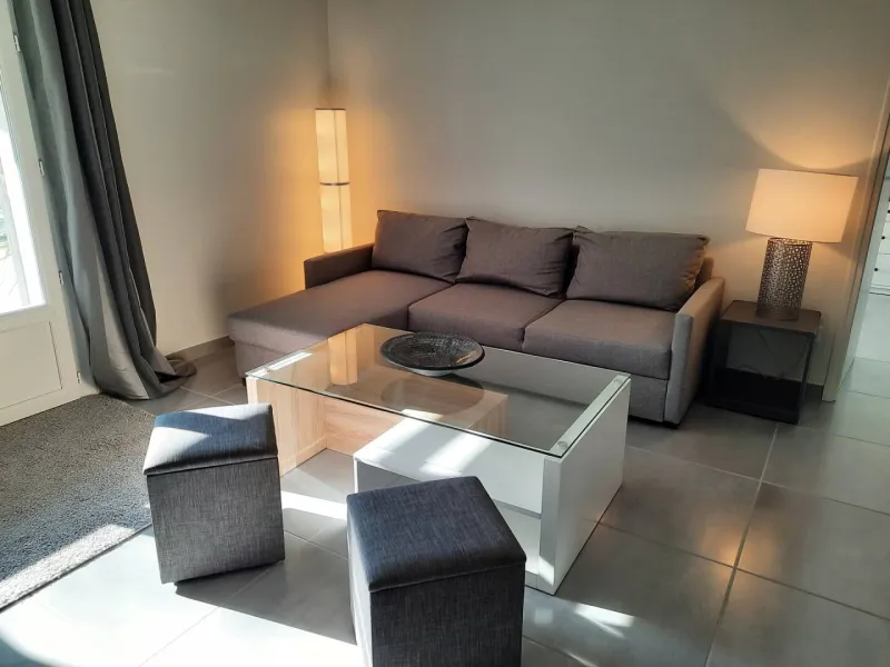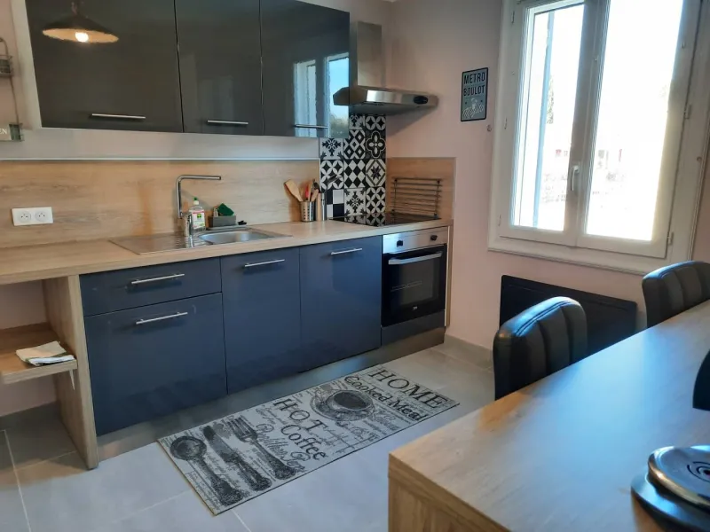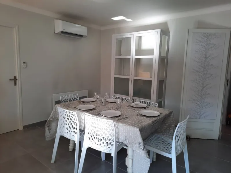 Tout en rez de chaussée, vous trouverez une salle à manger/salon climatisé avec canapé, TV. Une cuisine particulièrement bien équipée en électroménagers neufs (four, plaque vitrocéramique, lave-vaisselle, lave-linge).