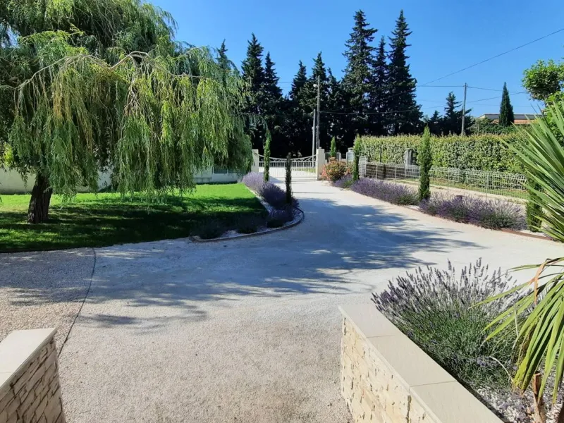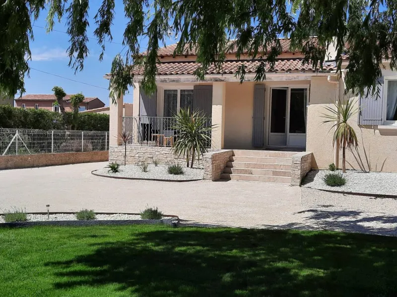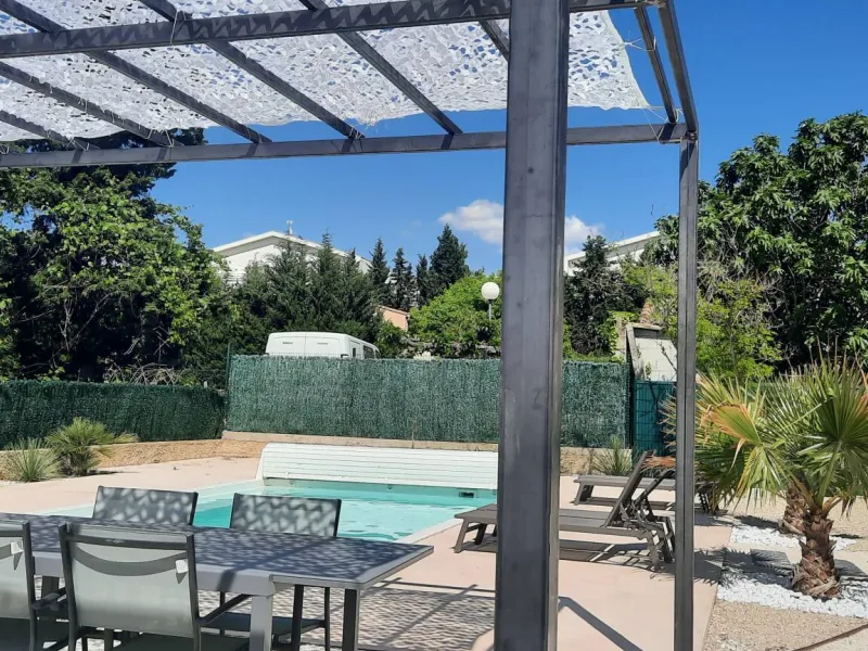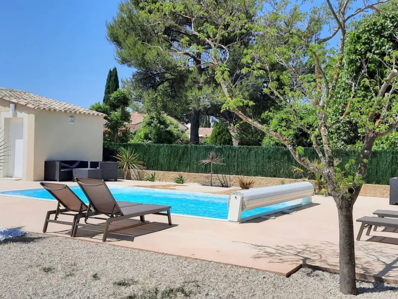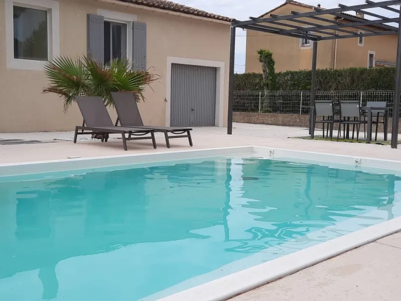 A l'arrière de la maison vous disposerez d'un espace de vie et de détente avec une piscine privée (7x4,profondeur 1.40 m, ouverte du 15/05 au 30/09) sécurisée par un volet roulant, entourée d'une plage avec bains de soleil. Terrasse couverte de 20 m² au sud. Jardin clos de 800 m². Parking fermé avec portail électrique. Combiné barbecue/plancha. Garage pour vélos. Terrain de pétanque.