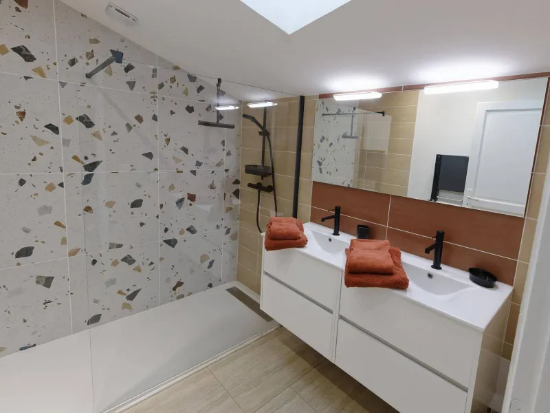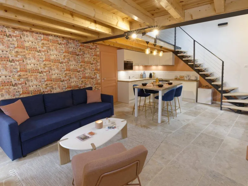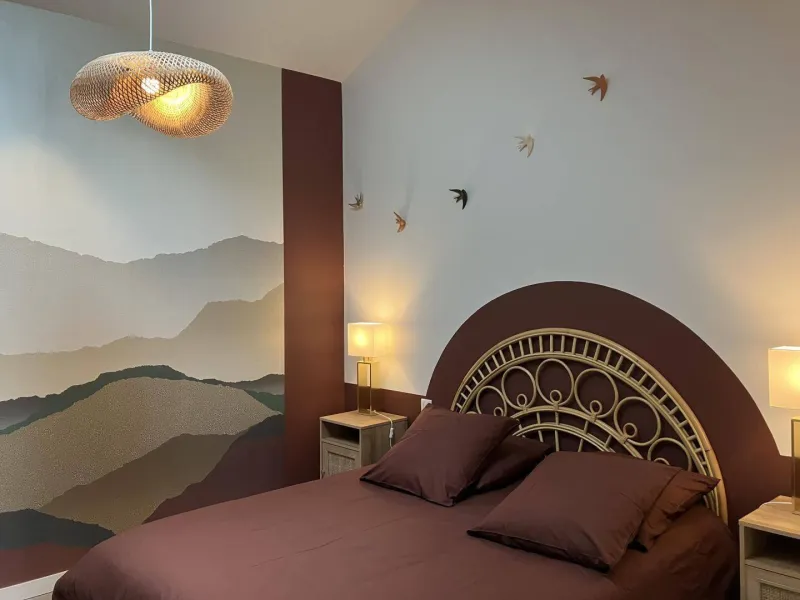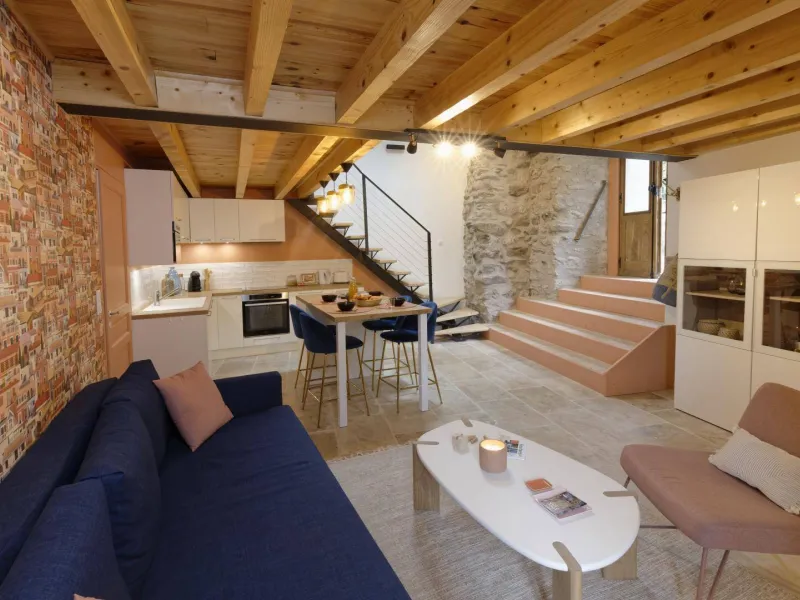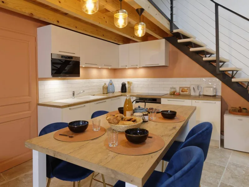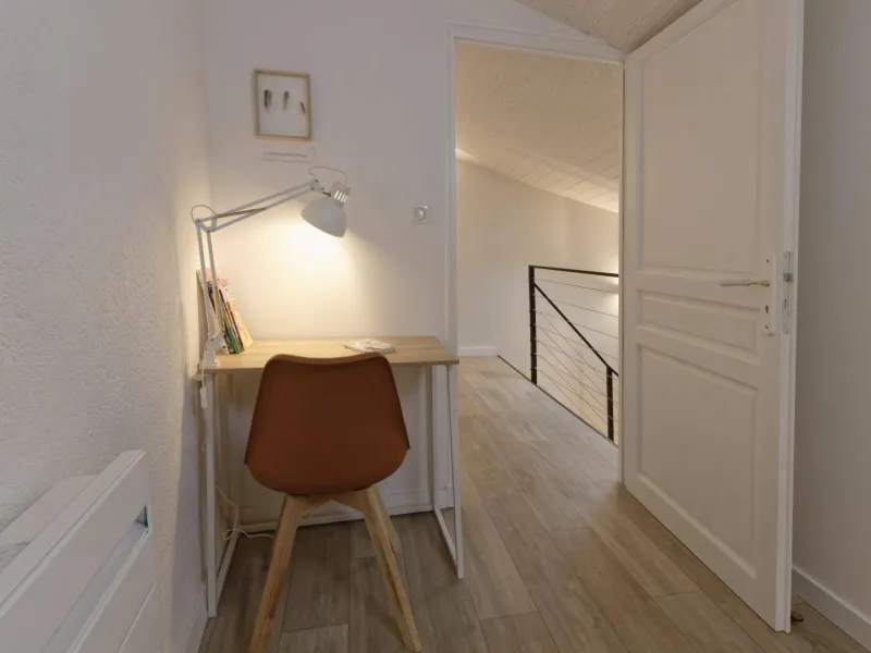 C'est sur les hauteurs du village de Montferrier, côté jardin que se situe l'entrée de ce gîte. La carte de la modernité aux teintes méditerranéennes alterne avec le bois et les pierres apparentes du lieu. On admire ce contraste harmonieux contemporain du séjour et de l'escalier en acier, qui rejoint l'espace nuit plus traditionnel avec les poutres apparentes. Le plus, sont les prestations de service proposées par les propriétaires qui s'investissent pour faire revivre ce village à proximité du Château de Montségur et sur la route de la station de ski des Monts d'Olmes : cours de yoga, massage, repas. Possibilité de réunir les gites 1 et 2 du presbytère pour accueillir 13 personnes.Rez-de-chaussée : Séjour avec Coin Cuisine intégrée et espace salon (téléviseur écran plat, accès Internet. Wc avec lave-mains. Étage : Palier avec bibliothèque variée. Dégagement aménagé en espace buanderie avec lave et sèche-linge. wc avec lave-mains. 1 chambre avec 2 lits 1 pers. 1 chambre avec 1 lit 2 pers (160 cm), Salle d'eau avec douche à l'italienne, double vasque, radiateur porte-et sèche-serviettes .Jardin en partie clos accessible par le 1er étage. Il est commun avec le grand gîte et comprend tables de jardin, chaises, plancha, table de ping-pong commune. Parking privatif commun situé à proximité. Équipement bébé. Chauffage électrique avec climatisation réversible dans le séjour. Possibilité de réunir les gites 1 et 2 du presbytère pour accueillir 13 personnes. Point de recharge électrique communal à 200 .